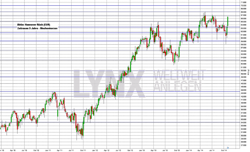 In den vergangenen fünf Jahren war bei der Aktie der Hannover Rück (Börsenkürzel: HNR1 / ISIN: DE0008402215) der Vorteil des Öfteren auf der Long-Seite zu finden. Lediglich zwei Phasen durchbrachen die längeren Aufwärtstrends – eine im Jahr 2011 und eine im Jahr 2013. Trendtrader konnten trotzdem gute Resultate erzielen, gerade in der sauberen Aufwärtsbewegung von Oktober 2011 bis April 2013. Seit Anfang diesen Jahres stagniert der Wert etwas und die Unterstützung im Bereich um die Marke von 59,00 Euro scheint sich als etwas stärker herauszukristallisieren. Nach einem erneuten Test der erwähnten Unterstützung steht die Aktie bei knapp 67,00 Euro, nur knapp einen Euro unter dem Hoch der ersten Jahreshälfte. Kurse oberhalb der Unterstützung 59,00 Euro sind aus aktueller Sicht weiterhin als long zu werten. Käufe an Unterstützungen könnten somit als ideale Einstiegsszenarien gewertet werden. Kurse in Richtung neuer Hochs und somit Kursbereiche von 70,00 Euro und mehr sind nicht auszuschließen. Auch ein direkter Kauf der Aktie und die damit einhergehende Spekulation auf recht schnelle neue Hochs stellt sich als Option dar, wobei dieses Szenario als aggressiv zu werten ist. Ein Grund hierfür ist, dass charttechnisch kein guter Stopp-Punkt gefunden werden kann und dieser lediglich in die Bewegung der vergangenen zwei Wochen hineingesetzt werden könnte.