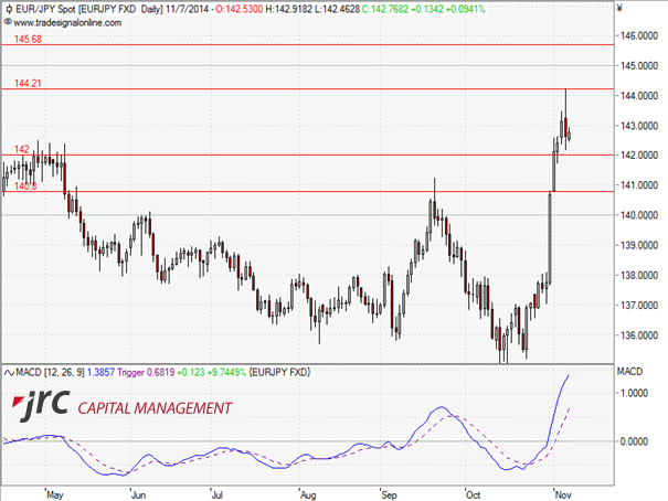 Schwächelnde Konjunkturdaten und eine drohende Deflation belasten seit Monaten sowohl den Yen als auch den Euro. Dementsprechend verlief auch der Kurs des Währungspaares. Lediglich die Veröffentlichungen von Wirtschaftsdaten sowie die Handlungen und Aussagen der jeweiligen Notenbanken sorgten für stärkere Bewegungen. Wie am 31. Oktober, als die Bank of Japan ihr QE nochmals erhöhte und dadurch der Euro gegenüber dem Yen stark an Wert gewann. Derzeit notiert er bei 142,76.