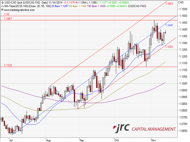 Wie es für einen Aufwärtstrend typisch ist, verlief der Kurs des USD/CAD in den letzten Monaten stets über seinen langfristigen gleitenden Durchschnitten und bewegte sich im Trendkanal der „Andrew‘s Pitchfork“. Nach dem Erreichen eines neuen Fünfjahreshochs korrigierte der Kurs und steht derzeit bei 1,1377 Kanadischen Dollar pro US-Dollar.