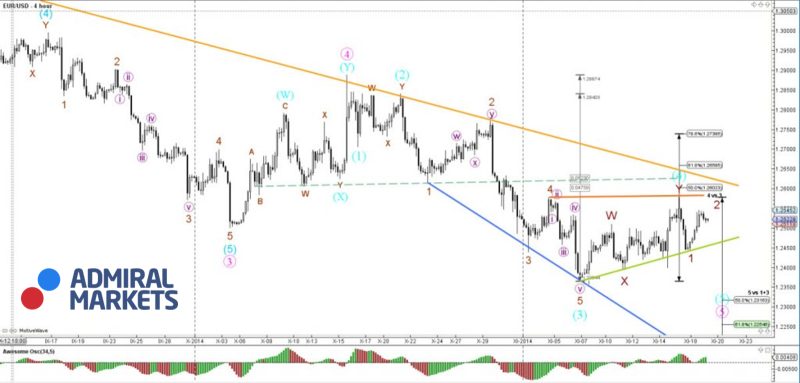 Das Paar prallte von der Trend-Unterstützungslinie (grün) ab, was als Teil der Welle 2 (rot) verstanden werden kann, deren kritischer Level bei Beginn der Welle 1 (rot) ansetzt. Die Veröffentlichung des FOMC-Sitzungsprotokolls könnte die ganze Situation verändern. So könnten sich beispielsweise die Wellen 1-2 nun als Fortsetzung der Korrekturwelle 4 (blau) erweisen.
