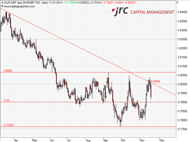 Sollte der Kurs weiter fallen, so dürfte die runde Marke bei 0,79 als Unterstützung fungieren. Im Falle einer weiteren Abwertung des Euro träfe der Kurs auf den tiefsten Stand der letzten sechs Jahre bei 0,7762. An diesem Bereich prallte der Kurs bereits im September ab, nachdem er dort sein aktuelles Jahrestief bei 0,7766 erreichte.