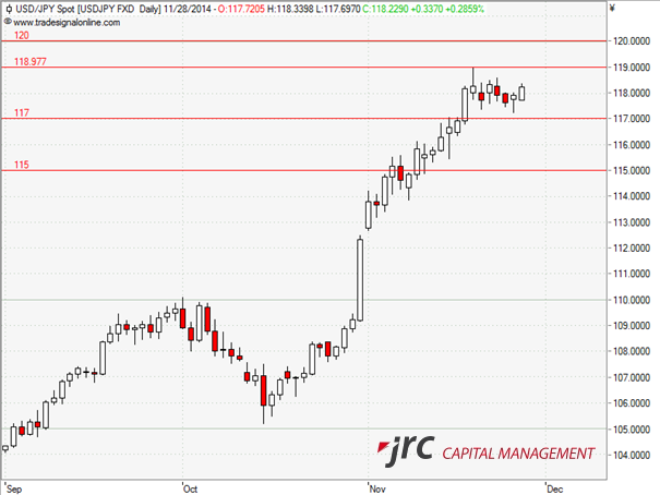 Während in den ersten beiden Wochen des Oktobers eine Korrektur stattfand, legte der Greenback gegenüber dem Yen in der zweiten Monatshälfte sowie im November wieder zu und erreichte ein neues Siebenjahreshoch. Der japanische Finanzminister Taro Aso zeigte sich besorgt über die rasante Abwertung des Yens und kritisierte die starken Schwankungen der Wechselkurse.