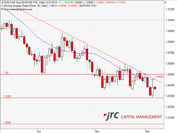 Damit der EUR/USD erneut über 1,25 klettert, müsste der Kurs um rund 150 Pips steigen – ein durchaus machbares Szenario, welches allerdings von der weiteren wirtschaftlichen Entwicklung der Eurozone sowie von der Geldpolitik der EZB abhängt. Im Falle eines Kursanstiegs träfe der Kurs auf einen Kreuzwiderstand bei 1,2465, wo derzeit die Trendlinie vom Juli sowie der gleitende Durchschnitt der letzten 20 Tage verlaufen. Der nächste Widerstand wäre dann die psychologische Schwelle bei 1,25.