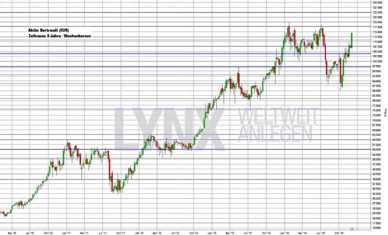 Die Bertrandt AG bilanziert gemäß IFRS jeweils zum 30.09. eines Jahres. Der Konzern hat in den vergangenen Jahren stets beim Umsatz zugelegt. Von den 384,6 Mio. Euro Gesamtumsatz des Jahres 2009 aus ging es stetig aufwärts. 2013 konnte man einen Gesamtumsatz von 782,4 Mio. Euro ausweisen. Der Erfolg zeigt sich quer durch alle Bestandteile der Bilanz. Das Ergebnis der gewerblichen Geschäftstätigkeit belief sich 2013 auf 81,5 Mio. Euro, das Zinsergebnis lag bei 568.000 Euro und der Jahresüberschuss bei 57,2 Mio. Euro. Je Aktie netto ergab sich für 2013 ein Gewinn von 5,68 Euro. Die Dividenden sind in den letzten Jahren ebenfalls gestiegen. Wurden 2009 noch 1,00 Euro an die Aktionäre ausgeschüttet, so sind es für 2013 bereits beachtliche 2,20 Euro. Damit hat sich die Dividende mehr als verdoppelt. Auch die Anzahl der Mitarbeiter stieg in den letzten Jahren erheblich. 2009 wiesen die Bücher erst 5.723 Mitarbeiter aus, für 2013 sind es bereits 10.398. Demnach hat sich auch die Mitarbeiterzahl fast verdoppelt. Gemäß der Bilanz verfügte das Unternehmen 2013 über 47,3 Mio. Euro an liquiden Mitteln, 217,5 Mio. Euro an wirtschaftlichem Eigenkapital, 10,1 Mio. Euro an gezeichnetem Kapital, 78,5 Mio. Euro an Verbindlichkeiten, 221.000 Euro an Verbindlichkeiten gegenüber Kreditinstituten und brachte es demnach auf eine Bilanzsumme von 408,1 Mio. Euro. Die Bilanzprognosen für 2014 und 2015 weisen eine Umsatzerwartung von 860,60 beziehungsweise 938,10 Millionen Euro aus. Das EBIT steigt 2014 demnach auf 88,15 Mio. Euro, für 2015 sollen es bereits 97,45 Mio. Euro sein. Der Gewinn je Aktie soll 2014 auf 6,02 Euro und 2015 auf 6,61 Euro anwachsen. Dies wird sich den Prognosen zufolge auch auf die Dividenden auswirken. Für 2014 könnten 2,40 Euro und für 2015 2,60 Euro ausgezahlt werden. Der Nettogeldbestand könnte sich in den kommenden beiden Geschäftsjahren weiter leicht reduzieren. Für 2014 soll er bei 33,20 Mio. Euro liegen und 2015 auf 30,05 Mio. Euro gesunken sein. Vergleicht man die Performance der Aktie mit der Entwicklung des DAX, so wird man der Bertrandt-Aktie den Status „Outperformer“ zuweisen. Auf Sicht der letzten fünf Jahre hat das Wertpapier um beinahe 480 Prozent zugelegt mit einem Tief von 19,80 Euro und einem Hoch von 119,85 Euro. Die Aktionäre sind also erfolgsverwöhnt. Wahrlich keine einfache Aufgabe, diese Performance fortzusetzen. Am Donnerstag, den 11.12.2014 wird die Bertrandt AG ihren Geschäftsbericht 2013/2014 vorlegen, parallel dazu finden die Bilanzpressekonferenz und die Analystenkonferenz statt.