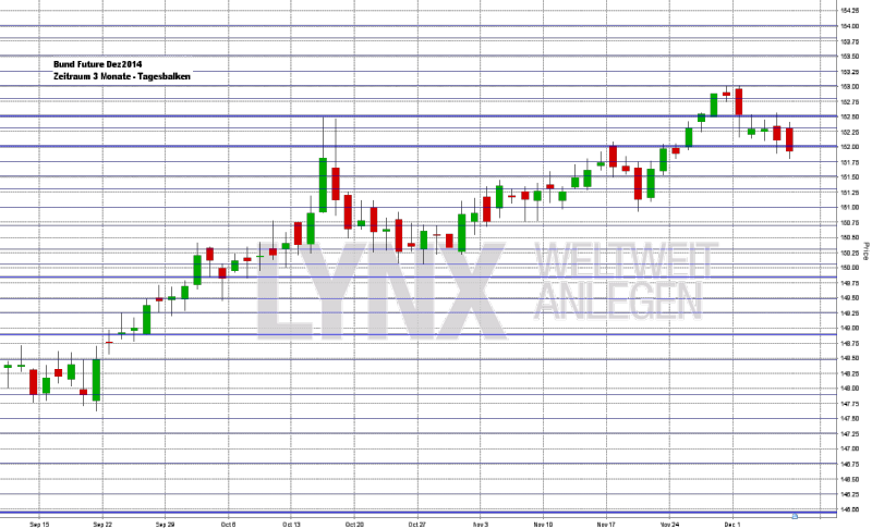 Der Bund-Future tanzte in den vergangenen Handelstagen leicht aus der Reihe und musste am Ende gut 100 Ticks nachgeben. Käufe an den Unterstützungen waren somit nur bedingt erfolgreich. Das Wochenhoch am Montag bei rund 153,00 Zählern war kein neues Allzeithoch und es ging hauptsächlich stetig abwärts. Das Wochentief bei etwa 151,80 Punkten wurde dann am Freitag markiert und auch der Wochenschlusskurs lag recht schwach im Bereich der Unterstützung 152,00. Mit aller Vorsicht wäre folgende Sichtweise denkbar: Kurse oberhalb der Unterstützung 152,00 wären noch mit dem Long-Vorteil verbunden und der eine oder andere Long-Trade könnte weiterhin in Trendrichtung eingegangen werden. Kurse unter diesem Bereich wären vorerst etwas kontraproduktiv für die Kaufseite. Große Vorsicht und eine damit verbundene Trading-Pause im Bund-Future könnten also in diesem Fall nicht schaden.