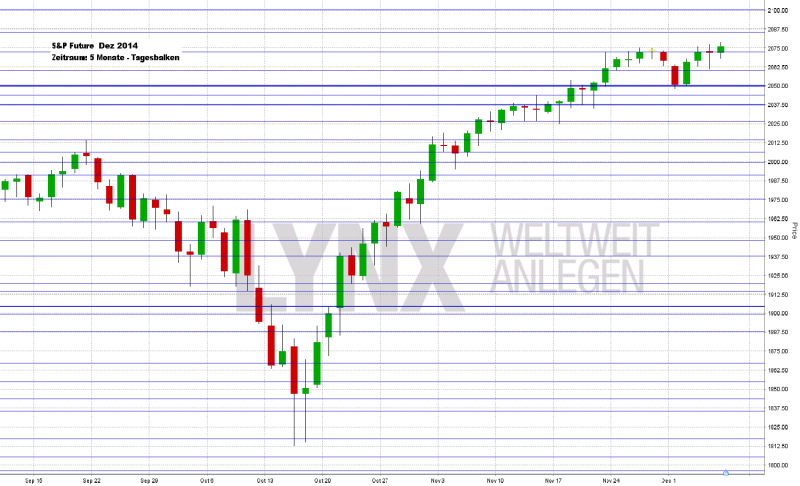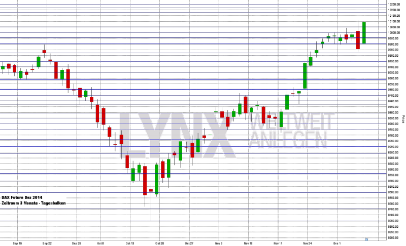 Mit einem großen Schritt hat sich der deutsche Leitindex DAX am Freitag von der 10.000er-Marke nach oben absetzen können. Einmal mehr hat die EZB, allen voran Mario Draghi, die Aktienmärkte beflügelt, aber auch gute US-Arbeitsmarktdaten trugen zur prositiven Entwicklung bei. Auf Wochensicht legte der DAX um 1,06 Prozent zu und beschloss den Xetra-Handel bei 10.087,12 Punkten auf einem neuen Rekordstand. Der XDAX schloss bei 10.080,58 Punkten nur unwesentlich niedriger. Damit beziffert sich die Bilanz seit Jahresbeginn 2014 auf +5,60 Prozent. An der Wall Street setzte sich die Hausse ebenfalls fort. Der Dow Jones beendete den Handel mit einem Wochenplus von 0,73 Prozent und 17.958,79 Punkten. Auch dieser Markt jagt von Allzeithoch zu Allzeithoch. Die 18.000-Punkte-Marke steht jetzt als nächste psychologische Hürde an. An der Technologiebörse NASDAQ schloss der NASDAQ 100 dagegen mit einem Wochenminus von 0,60 Prozent bei 4.311,573 Punkten. Der breiter gefasste S&P 500 ging mit einem Plus von 0,38 Prozent und 2.075,37 Punkten ins Wochenende. Die europäische Gemeinschaftswährung Euro notierte gegenüber dem US-Dollar zum Wochenschluss bei 1,2286 und damit deutlich tiefer. Ein Fass Öl der Nordseesorte Brent kostete zum Handelsende 69,07 US-Dollar. Die Feinunze Gold notierte zum Wochenschluss bei 1.191,10 US-Dollar. Der Euro-Bund-Future schloss am Freitag mit 152,12 Zählern und indiziert damit eine Rendite der zehnjährigen Bundesanleihe von 0,78 Prozent. Am Montag steht der Kontraktwechsel vom Dezember- in den März-Kontrakt an. Der März-Kontrakt handelt bei 152,81, also rund 70 Ticks höher.