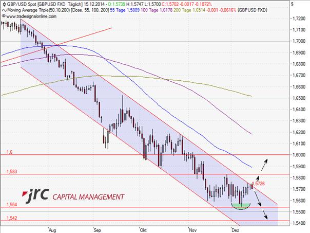 Sollte der Kurs es schaffen, den Trendkanal auf Tagesschlusskursbasis zu verlassen, könnte eine Erholung einsetzen. Das erste Kursziel wäre in diesem Fall das derzeitige Verlaufshoch der Seitwärtsbewegung bei 1,5830. Darüber wäre der nächste starke Widerstand bei der psychologisch wichtigen Marke von 1,60 zu finden.