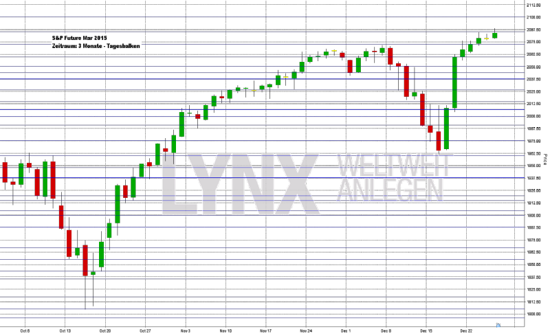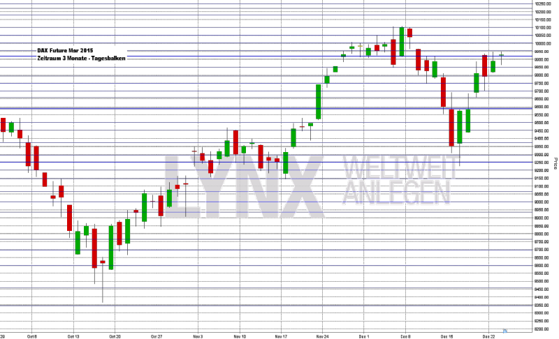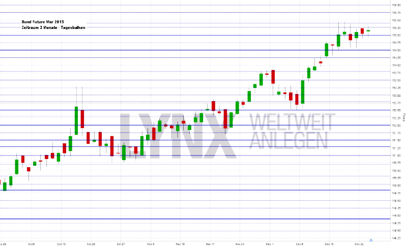 In der abgelaufenen Börsenwoche ging der DAX auf Xetra-Basis mit 9.922,11 Punkten in die Weihnachtspause. Damit beläuft sich die Performance von 2014 auf + 3,87 Prozent. Der XDAX schloss um 22:15 Uhr mit 9.899,17 Punkten niedriger. An der Wall Street brachte es der Dow Jones auf neue Rekordstände. Die Marke von 18.000 Punkten wurde überschritten, der Index ging mit 18.053,71 Punkten ins Wochenende (am 26.12. wurde in den USA wieder gehandelt). Die Jahresperformance von 2014 liegt derzeit bei 11,47 Prozent und damit im Vergleich zum DAX beinahe dreimal so hoch. Der deutsche Leitindex wurde somit vom Dow Jones klar geschlagen. Der NASDAQ Composite beendete den Freitagshandel an der Technologiebörse NASDAQ bei 4.806,86 Punkten und auf Jahressicht mit einem Plus von 16,54 Prozent. Der breiter gefasste S&P 500 notierte zum Handelsschluss bei 2.088,77 Punkten und liefert bis dato eine Jahresperformance von 15,32 Prozent ab. Die US-Märkte beendeten die Handelswoche also eindeutig im grünen Bereich und zeigen auch auf Jahressicht deutlich Stärke. Die europäische Gemeinschaftswährung Euro tendierte überwiegend schwach und konnte sich nicht von ihren Verlusten erholen. Zum Wochenschluss notierte der Euro bei 1,2183 US-Dollar auf einem längerfristigen Tief. Rohöl der Nordseesorte Brent kostete am Freitagabend 59,45 US-Dollar je Fass im Februar-Kontrakt. Der Preis für eine Feinunze Gold lag zum Wochenschluss bei 1.196,00 US-Dollar. An der EUREX ging der Euro-Bund-Future mit runden 155,00 Zählern ins Wochenende. Dementsprechend rentieren zehnjährige Bundesanleihen jetzt mit 0,59 Prozent. Für 2015 plant der Bund Emissionen von nominalverzinslichen Bundeswertpapieren in Höhe von 185,5 Mrd. Euro. Inflationsindexierte Wertpapiere sollen im Volumen von 10 bis 14 Mrd. Euro ausgegeben werden. Die Aufzählung bezieht sich auf Schätze, Bobls, Bunds, Bubills und weitere Finanzierungsinstrumente des Bundes. Die ersten Auktionen beginnen ab dem 07.01.2015.