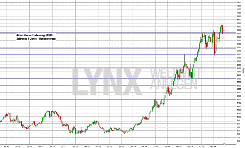 Aktien von Micron Technology haben 2014 bis dato um respektable 61 Prozent zugelegt und damit die US-Indizes deutlich geschlagen. Auf Sicht der letzten drei Jahre legte das Wertpapier einen phantastischen Lauf von rund +450 Prozent hin. Aus den Gewinnerwartungen für die nächsten vier Quartale errechnet sich gerade mal ein 9er-KGV – für ein Technologieunternehmen ein niedriger Wert. Das US-Magazin „Barrons“ hatte zuletzt in einem Artikel die Investoren bei Micron Technology als zurückhaltend und abwartend beschrieben. Die Preise für DRAM (das Hauptspeichermedium in der Computer-Hardware-Technologie) haben sich innerhalb von zwei Jahren verdoppelt. Diese Entwicklung könnte auf dem aktuellen Preisniveau zu einer vorübergehenden Überproduktion und somit zu einem Preisverfall führen. Das könnte den einen oder anderen Produzenten straucheln lassen.
