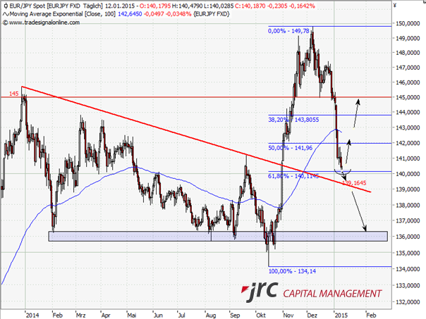Nachdem die Diskussion über den Verbleib Griechenlands in der Eurozone wieder aufgeflammt ist, beschleunigte sich die Abwertung des Euro zuletzt. Das macht sich auch im Kurs des EUR/JPY bemerkbar. So sank der Kurs des Währungspaars seit Jahresbeginn um etwa 400 Pips. Ein weiterer Grund für den Kursrückgang ist, dass der Yen nach seiner rasanten Abwertung der letzten Wochen momentan etwas konsolidiert.
