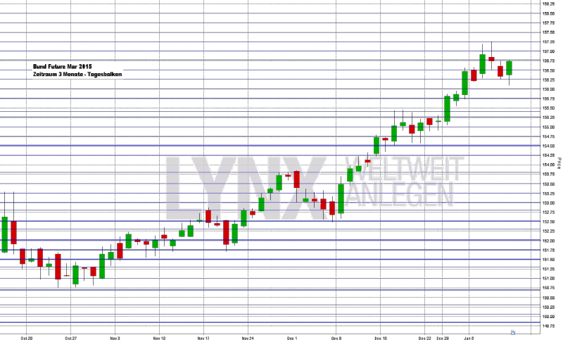 Die scheinbar endlose Reise des Bund-Future ging auch in der vergangenen Woche weiter und ein neues Hoch im Bereich 157,25 Punkte wurde erreicht. Käufe an Unterstützungen waren eine gute Strategie. Nach dem neuen Allzeithoch am Mittwoch gab der Markt dann leicht nach, ein Wochentief bei etwa 156,10 und der Schlusskurs am Freitag bei rund 156,35 Punkten waren das Ergebnis. Weiterhin bleibt das Zwischenhoch von 155,40 Zählern für den Long-Trend interessant. Käufe an Unterstützungen waren und sind generell die beste Einstiegslösung für die vorherrschende Marktsituation. Vorsicht sollte gegebenenfalls bei zunehmendem Short-Momentum aufkommen, da Käufe in diesem Fall ihren Trendvorteil verlieren könnten.