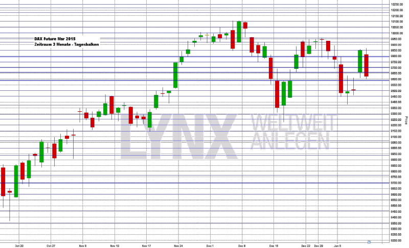 In der abgelaufenen Handelswoche ging der deutsche Leitindex DAX mit 9.648,50 Punkten aus dem Xetra-Handel, auf Wochensicht schloss er mit einem Minus von 1,19 Prozent. Damit bleibt die Jahresperformance 2015 mit -1,60 Prozent weiterhin im negativen Bereich. Der X-DAX notierte um 22:15 Uhr mit 9.670,90 Punkten nur etwas freundlicher. Der Dow Jones schloss am Freitag an der Wall Street mit 17.737,37 Punkten und brachte es auf eine Wochenperformance von -0,54 Prozent. Der NASDAQ 100 beendete die Woche an der Technologiebörse NASDAQ bei 4.213,276 Punkten, das Wochenergebnis blieb mit -0,40 Prozent auch hier im roten Bereich. Der S&P 500 brachte es mit 2.044,81 Punkten auf ein Wochenminus von 0,65 Prozent. Die Feinunze Gold legte gegenüber der Vorwoche zu und kostete zum Ende der Woche 1.223,25 US-Dollar. Rohöl der Nordseesorte Brent stand zum Wochenschluss bei 50,11 US-Dollar pro Fass – die Talfahrt geht also auch im neuen Jahr weiter! Die europäische Gemeinschaftswährung Euro zeigte sich weiter schwach und notierte zum Wochenschluss bei 1,1841 US-Dollar. Der Euro-Bund-Future notiert zum Ende der Woche mit 156,44 Zählern stark. Er indiziert die zehnjährige Bundesanleihe mit einer Rendite von rund 0,49 Prozent. Für den 14.01.2015 plant die deutsche Finanzagentur eine Auktion von zehnjährigen Bundesanleihen in Form einer Neuemission mit einem Volumen von 5 Mrd. Euro.
