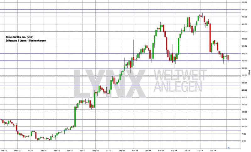 Seit dem vierten Quartal 2012 bewegt sich die Aktie von Netflix NFLX [NASDAQ] / ISIN: US64110L1061) tendenziell nach oben. Von Oktober 2012 bis März 2014 entstand ein sehr sauberer Aufwärtstrend, welcher trendfolgend recht gut ausgenutzt werden konnte. Vom Tief bei rund 50 US-Dollar ging es hinauf bis gut 450 US-Dollar hinauf, was einer Wertentwicklung von etwa 800 Prozent entspricht. Ab dem zweiten Quartal 2014 setzte eine etwas volatilere Seitwärtsphase ein, welche kurzzeitig nochmals neue Hochs ausbildete. Aktuell befindet sich der Wert am unteren Rand dieser Seitwärtsphase bei gut 325 US-Dollar. Auffällig ist eine starke Momentum-Bewegung Ende des vergangenen Jahres, welche von 450 US-Dollar hinunter bis zur Marke von 325 US-Dollar führte – ein Wochenminus von rund 28 Prozent. Mehrfach hat die Unterstützung bei 325 US-Dollar in den vergangenen zwölf Monaten gehalten und somit könnte dieser Bereich eine richtungsweisende Rolle spielen. Ein Unterschreiten wäre gegebenenfalls ein Signal für weitere Down-Moves, welche durchaus in Richtung 275/250 US-Dollar führen könnten. Spekulativ käme aus aktueller Sicht eine antizyklische Idee in Frage – der Kauf am unteren Ende der Seitwärts-Range (aktueller Kursbereich) mit dem Gedanken eines erneuten Pullbacks in Richtung 375 US-Dollar und höher.