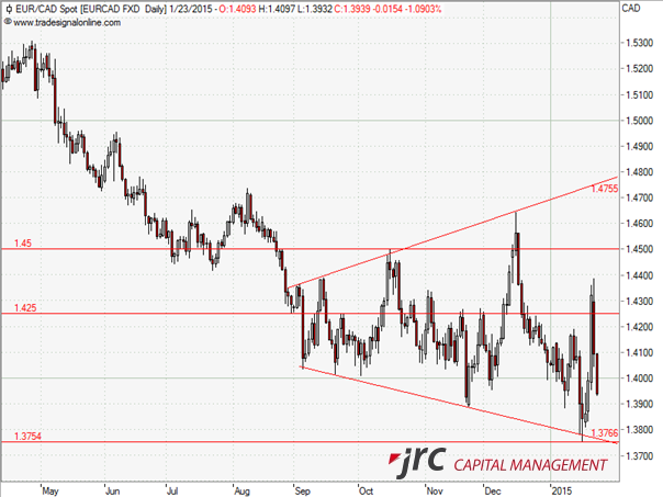 Lange wurde dieser Schritt von der EZB erwartet. 60 Milliarden Euro monatlich möchte die Europäische Zentralbank für Anleihenkäufe ausgeben. Diese Meldung hatte starke Bewegungen in sämtlichen Europaaren zur Folge. Nachdem die Bank of Canada überraschenderweise ihren Leitzins von 1,0 auf 0,75 Prozent gesenkt hatte, ging es für den EUR/CAD steil bergauf. Mit derselben Dynamik gab das Währungspaar auf die Ankündigung der EZB hin nach.