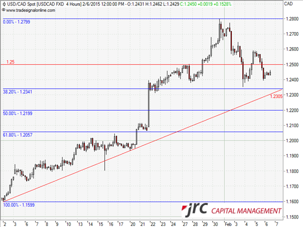 Belastet von fallenden Rohstoffpreisen wertete der Loonie auch im Januar weiter ab. Allein im Januar stieg der USDCAD um ca. 1200 Pips. Dazu beigetragen hat auch die Entscheidung der Bank of Canada, den Leitzins erstmals seit vier Jahren auf 0,75 Prozent zu senken.