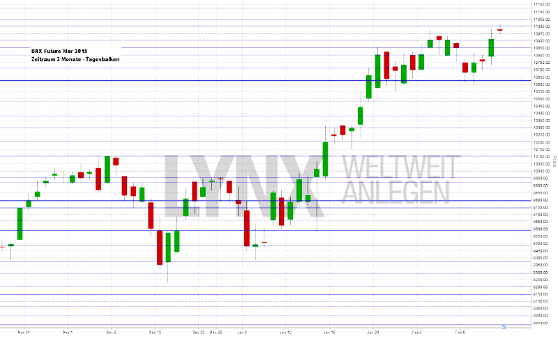 Nur knapp erreichte der DAX-Future ein neues Allzeithoch, die Marke von 11.000 Punkten wurde aber geknackt. Ging es am Montag noch hinunter an die Unterstützung 10.625 Punkten, so stand ab Dienstag wieder die Long-Richtung im Vordergrund und der Markt arbeitete sich Tag für Tag etwas höher. Auch der Schlusskurs von Freitagabend lag auf sehr hohem Niveau, nur knapp unter der Marke von 11.000 Punkten. In den kommenden Tagen bleibt der Vorteil der Long-Richtung weiterhin bestehen, solange der Markt die Unterstützung bei 10.625 Punkten nicht nachhaltig nach unten durchbricht. Weiterhin könnte das Erreichen neuer Allzeithochs als recht realistisch angenommen werden. Käufe an Unterstützungen beziehungsweise Käufe nach leichten Konsolidierungen könnten generell die beste Option darstellen. Die Short-Seite ist aus aktueller Sicht kaum eine Überlegung wert, es sei denn, ein Short-Momentum käme auf.