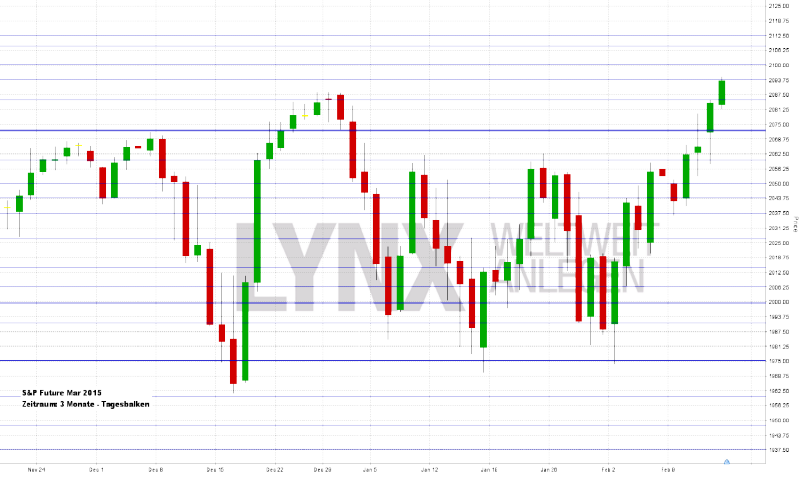 Gleich am Dienstag stieg der S&P-Future nachhaltig über die Marke von 2.060 Punkten und leitete damit seinen erwarteten Ausbruch aus der vorherigen Seitwärts-Range ein. Lediglich am Montag ging es leicht abwärts zum Wochentief bei 2.037 Punkten. Das Wochenhoch lag nur knapp unter dem neuen Allzeithoch bei rund 2.093 Punkten. Die Long-Richtung scheint zurückgekehrt zu sein. Ob es für den S&P-Future weiter aufwärts geht, entscheidet unter anderem die Unterstützung im Bereich um die Marke von 2.071 Zählern. Kurse darüber sprechen eine klare Long-Sprache und Käufe wären von Vorteil. Kurse darunter wären erneut mit etwas mehr Vorsicht zu bewerten, wären jedoch ebenfalls tendenziell long. Bei einem Rückfall der Kurse unter die Unterstützung 2.060 sollte zurückhaltend gehandelt werden, da die Long-Bewegung dann als ein Fehlausbruch zu werten wäre.