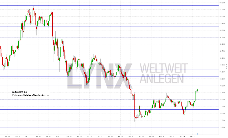 Die Aktie der K+S AG kostete in den letzten 52 Wochen maximal 28,935 Euro und im Tief 19,12 Euro. Der Durchschnittskurs der letzten 250 Tage lag bei 23,93 Euro. Auf Sicht der letzten fünf Jahre entwickelte sich die Aktie mit einem Minus von immer noch traurigen 33,5 Prozent stark unterdurchschnittlich gegenüber dem restlichen deutschen Markt (Benchmark DAX). Die Aktien der K+S AG befinden sich zu 23 Prozent in Händen von US-Investoren, 20 Prozent werden in Deutschland gehalten, Großbritannien steht für einen Anteil von 16 Prozent, die Schweiz für 9 Prozent, Luxemburg für 7 Prozent und der Rest verteilt sich mit 25 Prozent Anteil auf weitere Länder. Man erkennt deutlich den höheren Anteil an Ländern, in denen es verstärkt große Investmentfonds und Private-Equity-Gesellschaften gibt. Der Anteil institutioneller Investoren liegt insgesamt bei 58 Prozent, der privater Investoren bei 37 Prozent (Stand: November 2014). Die größten Anteilseigner sind Meritus Trust Company mit 4,92 Prozent (Stand 04.02.2015 gemäß Stimmrechtsmeldungen) und BlackRock mit 4,85 Prozent (Stand: 20.11.2014 gemäß Stimmrechtsmeldungen).