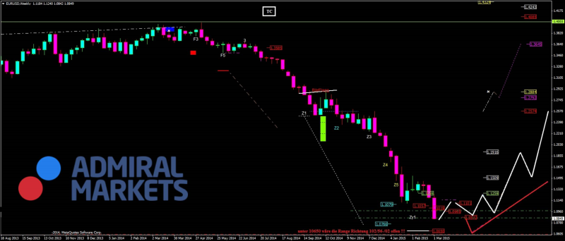 Die Range im Betrachtungszeitraum der KW 10/11 war mit 484 Pips deutlich höher als im Betrachtungszeitraum 25.02. bis 03.03. Hier hatte die Range nur bei 236 Pips gelegen. Das Wochenhoch bei 1,1177 lag über 200 Pips unter dem Wochenhoch der KW 10/11. Der Euro hat gestern (10.03.2015) ein neues Jahrestief bei 1,0693 ausgebildet.