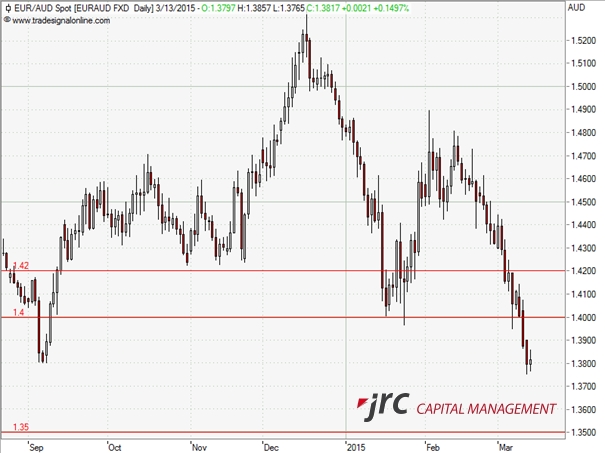 Mit Beginn des QE der EZB im März geriet der EURAUD noch mehr unter Druck, fiel unter die 1,40 und somit gleichzeitig unter die Nackenlinie der Schulter Kopf Schulter Formation.