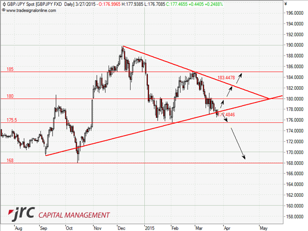 Während der Kurs des GBPJPY in den letzten Monaten des vergangenen Jahres, hauptsächlich bedingt durch die monetäre Lockerung der japanischen Notenbank, noch stark anstieg, konsolidiert der Kurs seit Beginn des Jahres seitwärts. Die 14. Kalenderwoche zeigt sich relativ arm an kursrelevanten Wirtschaftsnachrichten. Am Montag werden Daten zur japanischen Industrieproduktion veröffentlicht. Es folgen am Dienstag Daten zum britischen Bruttoinlandsprodukt, sowie am Mittwoch und Donnerstag Markit-Index-Daten aus beiden Volkswirtschaften.