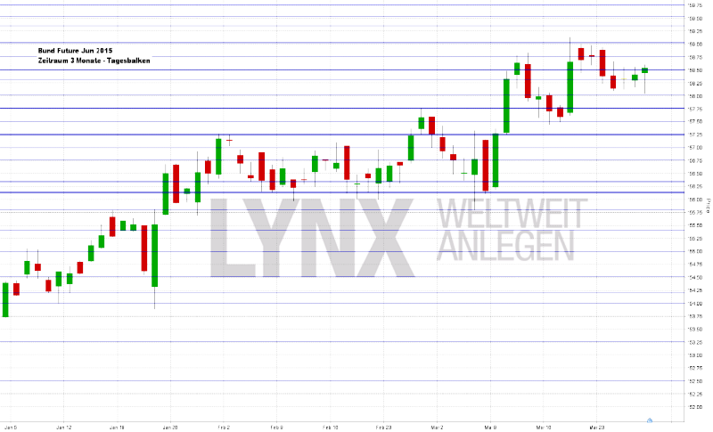 Die vergangene Woche brachte beim Bund-Future kaum Kursveränderungen mit sich. Nach einer leichten Konsolidierung des Marktes am Montag und Dienstag trat er am Mittwoch fast auf der Stelle, um am Donnerstag und Freitag erneut leicht zu steigen. Der Wochenschlusskurs lag leicht über der Marke von 158,50 Punkten und damit nur knapp 25 Ticks tiefer als in der Vorwoche.Solange der Markt nicht nennenswert unter die Marken 158,00 (kurzfristige Sicht) beziehungsweise 157,25 Punkte (mittelfristige Sicht) absinkt, sollte der Long-Vorteil weiterhin bestehen bleiben. Käufe mit dem Ziel 159,00 und gegebenenfalls in Erwartung neuer Hochs wären überlegenswerte Optionen. Falls der Markt anfängt, mit stärkerem Momentum abzusacken, sollte die Long-Seite mit etwas Vorsicht behandelt werden.