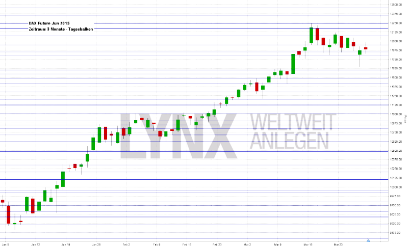 Der deutsche Leitindex konsolidiert auf hohem Kursniveau – nach elf Gewinnwochen in Folge ist dies als gesund zu bezeichnen. In der abgelaufenen Handelswoche verlor der DAX 1,42 Prozent und schloss mit 11.868,33 Punkten. Die Rekordmarke von 12.219,05 Punkten liegt nun ein Stück weit entfernt. Der XDAX stand um 22:15 Uhr mit 11.869,82 Punkten nur unwesentlich tiefer. An der Wall Street schloss der Dow Jones mit 17.712,66 Punkten. Die Rekordmarke liegt hier bei 18,288.63 Punkten. Das Wochenminus betrug 2,29 Prozent. Der NASDAQ 100 ging mit 4.332,862 Punkten sowie einer Wochenbilanz von -2,82 Prozent in das Wochenende, der Rekord steht bei 4.483,97 Punkten. Der breit gefasste S&P 500 schloss mit 2.061,02 Zählern, der Rekord sind 2.119,59 Punkte. Dies entsprach einem Wochenminus von 2,23 Prozent. Insgesamt bleibt festzuhalten: Die US-Märkte Dow Jones (-0,05 Prozent), NASDAQ 100 (+2,28 Prozent) und S&P 500 (+0,61 Prozent) laufen auf 2015er-Sicht dem DAX, dessen bisherige Jahresperformance 21,04 Prozent beträgt, deutlich hinterher. Der Euro ging mit einem Schlussstand von 1,0889 ins Wochenende. Der Preis für eine Feinunze Gold betrug vor dem Wochenende 1.198,55 US-Dollar. Rohöl der Nordseesorte Brent kostete im Mai-Kontrakt am Freitagabend 56,41 US-Dollar das Fass. Der Euro-Bund-Future bleibt auf Wochensicht stark und ging an der EUREX mit 158,49 Zählern aus dem Handel. Die Rendite für zehnjährige Bundesanleihen liegt derzeit bei 0,21 Prozent. Der Spread zwischen zehnjährigen deutschen Bunds und zehnjährigen US-Staatsanleihen (1,96 Prozent Rendite) liegt bei 175 Basispunkten. In der neuen Handelswoche begibt die deutsche Finanzagentur am Mittwoch Kapitalmarktinstrumente („Bobl“) mit fünfjähriger Laufzeit im Umfang von 4,0 Mrd. Euro (Aufstockung).