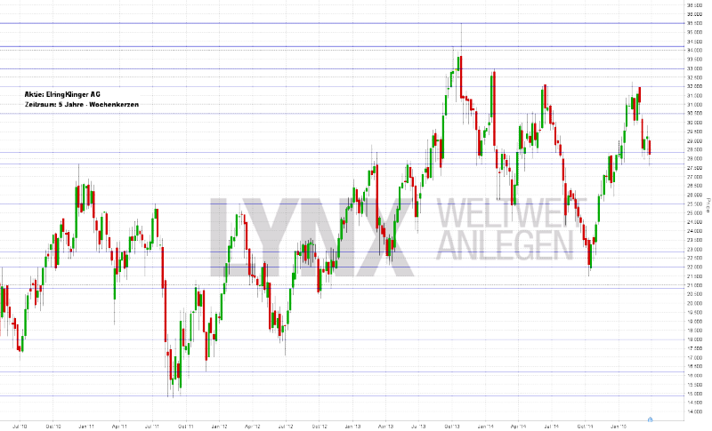 Die Aktie der ElringKlinger AG (Symbol: ZIL2 / ISIN: DE0007856023) präsentiert sich auf Sicht der vergangenen fünf Jahre generell positiv. Von dem Bereich um 20,00 Euro kommend, befindet sich der Wert jetzt etwas über 28,00 Euro – ein Plus von rund 40 Prozent. Trendfolgende Trading-Strategien ließen sich jedoch nur schwer umsetzen, da ein volatiles Hin und Her wegbegleitend war. So waren zum Beispiel in der Aufwärtsphase von Mitte 2011 bis Ende 2013 Korrekturen von 30 Prozent und mehr keine Seltenheit. Recht unpraktisch für ein sinnvolles Stop-Management in Trendmärkten. Betrachtet man den Wert jedoch aus einer etwas kurzfristigeren Sicht, so zeichnet sich eine sehr gute Basis für trendfolgende Ideen ab. Klare und saubere Trends entwickelten sich teilweise über wenige Wochen bis hin zu Trends über zwei bis drei Monate. Die Beobachtungen der Vergangenheit zeigen prinzipiell den Fahrplan für die Zukunft auf. Der Wert scheint für langfristige Trendfolgeideen kein Potenzial aufzuweisen. Es ist somit eher der mittelfristige bis kurzfristige Zeithorizont zu nutzen. Nach einer kurzen Trendanalyse können Trendeinstiege umgesetzt werden. Die aktuelle Situation zeigt mittelfristig einen Aufwärtstrend mit Potenzial für Kurse oberhalb der Marke von 33,00 Euro. Kurzfristig ist ein Abwärtstrend auszumachen – Trades mit dem Ziel neuer Tiefs unter 27,50 Euro wären eine Überlegung wert.