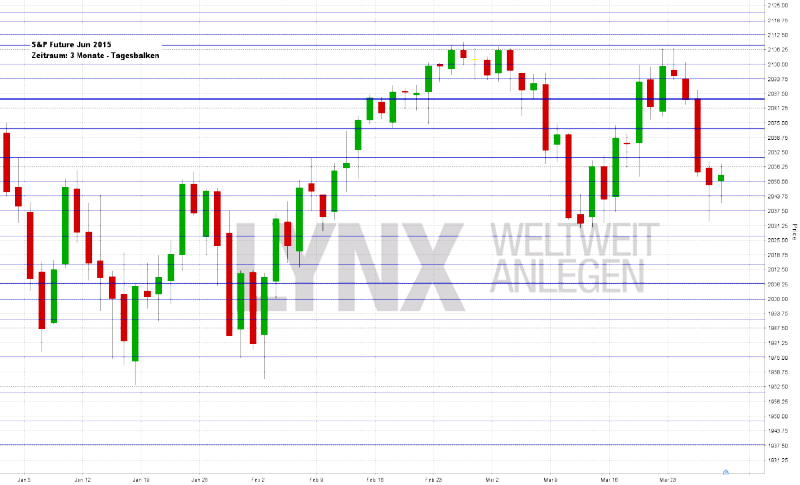 Generell war in den vergangenen Handelstagen zu beobachten, dass die Long-Seite nur geringe Chancen bot und der Markt vom Hoch knapp über 2.106 Punkten bis hinunter auf rund 2.032 Punkte fiel. Die angepeilten Käufe oberhalb der Unterstützung 2.085 waren somit nur bedingt erfolgreich – etwas bessere Ergebnisse erzielten die anvisierten Verkäufe unterhalb der Unterstützung 2.073. Der Wochenschlusskurs lag nur knapp über dem angepeilten Wochenziel der Short-Seite bei gut 2.050 Punkten. Wie auch schon Anfang des Jahres scheint sich im S&P-Future eine Seitwärtsphase herauszubilden, welche für trendfolgende Handelsstrategien oft nur wenige Vorteile bietet. Eine gewisse Grundvorsicht ist vor dem Hintergrund dieser Annahme somit nicht von Nachteil. Vorsichtig lassen sich allenfalls noch die Gedanken der Vorwoche weiter umsetzen, also Short-Trades unterhalb von 2.073 Punkten und Käufe oberhalb von 2.085 Punkten.