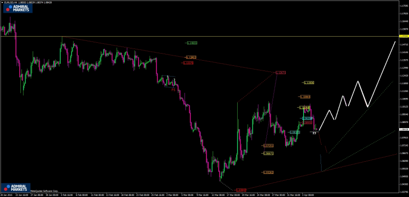Zu Beginn des letzten Betrachtungszeitraums bildete der EUR/USD einen kleinen Boden bei 1,0717/35 aus. Er steuerte in diesem Zusammenhang nicht mehr das Tief vom 31.03. an, sondern konnte sich kontinuierlich festigen und weiter ansteigen. Bis zum Gründonnerstag erreichte er die Marke 1,0900. Am Karfreitag überwand er diese Marke dynamisch und stieg bis 1,1036. Er erreichte jedoch das Hoch des vergangenen Betrachtungszeitraums nicht mehr. Zu Beginn der neuen Handelswoche fiel er in zwei dynamischen Schritten wieder zurück, konnte sich aber bei 1,0835 stabilisieren.