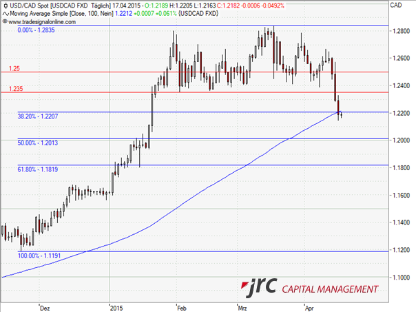 Fast das gesamte Jahr bewegte sich der USDCAD in einer Seitwärtsrange zwischen 1,2350 und 1,2835. Über diesen Zeitraum bewährte sich der Bereich um die 1,2350 als solide Unterstützung. Mit dem Unterschreiten dieses Bereiches wurde die Seitwärtsphase beendet und es könnte ein neuer Trend initiiert werden. Derzeit befindet sich der Kurs auf der Höhe einer Kreuzunterstützung, an der sich die 100-Tageslinie sowie das 38,20%-Fibonacci Retracement der Bewegung vom November letzten Jahres befinden.