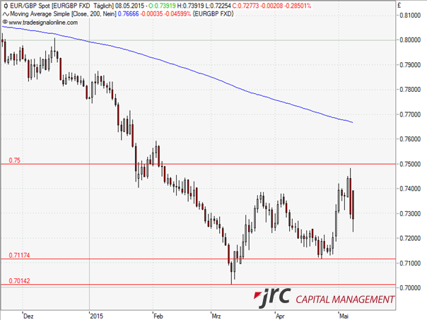 In den Tagen vor den Parlamentswahlen in Großbritannien geriet das Pfund zunächst unter Druck. Das relativ eindeutige Ergebnis für die konservative Partei von David Cameron lies nicht nur den Pfund Sterling gegenüber dem Euro und anderen Währungen an Wert dazu gewinnen, sondern auch den britischen Leitindex FTSE 100 mit einem Plus von 2 Prozent in den Handel starten. Das versprochene Referendum bezüglich eines „Brexit“ bleibt dennoch in Hinterköpfen der Anleger, dürfte aber in naher Zukunft keinen großen Einfluss haben.