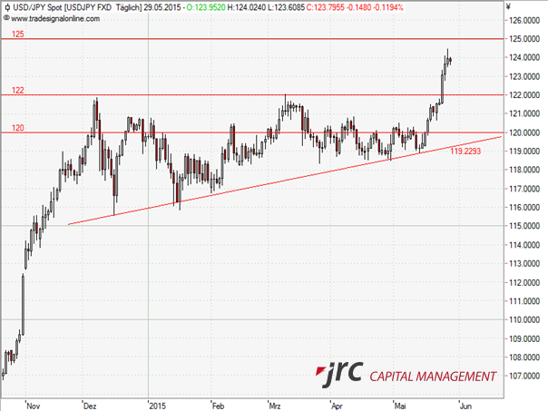 Mit dem Anstieg über der 122er Marke konnte der Kurs aus der Dreiecksformation ausbrechen und nochmals um über 200 Pips steigen. Das Hoch dieser Woche bei 124,45 war zugleich auch die höchste Notierung seit 12 Jahren.