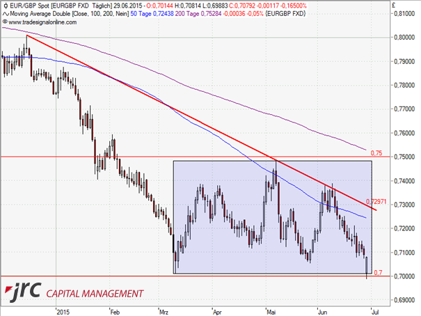 Das Pfund Sterling zeigt sich seit einigen Wochen stark. Die fundamentalen Entwicklungen in Großbritannien deuten auf einen möglichen Zinsschritt noch im Jahr 2015 hin. Der Euro hingegeben wird weiterhin durch die Griechenland-Debatte belastet. Nach dem am Wochenende angekündigten Referendum eröffnete der Euro in allem Währungspaaren deutlich schwächer mit einem Down-Gap.