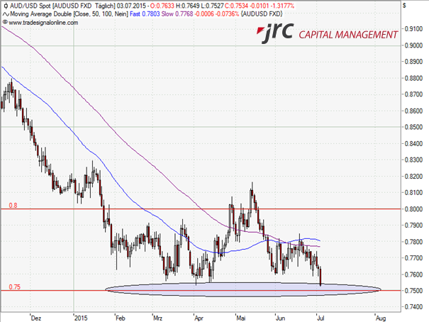Der Bruch und Re-Test der gleitenden Durchschnitte könnten auf eine Wiederaufnahme des Abwärtstrends hindeuten. Derzeit notiert der Kurs bei 0,7534 und somit auf den tiefsten Stand seit 2009.