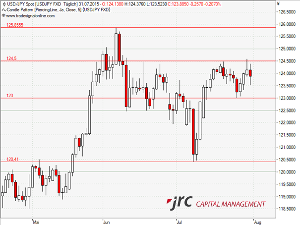 In ihrem letzten Statement bekräftigte die Fed nochmals die Bedeutung des Arbeitsmarktes für den Zeitpunkt der Zinserhöhung, verlor allerdings kein Wort über die jüngsten Entwicklungen an den chinesischen Börsen. Eine Zinserhöhung im September ist nach wie vor denkbar, scheint allerdings immer unwahrscheinlicher zu werden.