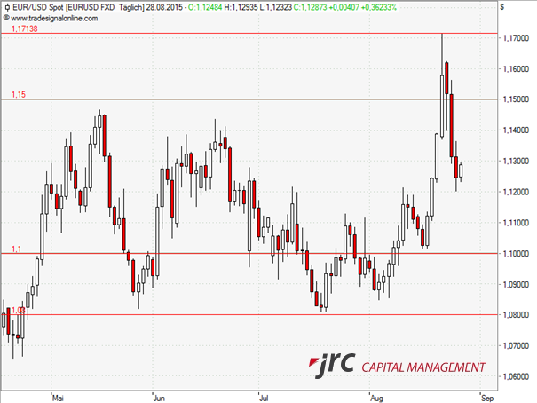 Der rasante Anstieg des EURUSD im August fand vorerst sein Zenit bei 1,1713, der höchste Preis seit Januar dieses Jahres. Dieses Level konnte der Kurs allerdings nicht halten und fiel bis auf 1,1203 zurück.