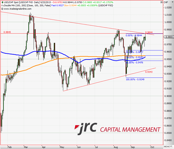 Im August fand eine steile Abwärtsbewegung statt, welche bei 0,99 begann und bis 0,9250 lief. Dabei wurden die wichtige 100- und 200- Tages-Durchschnittslinien gebrochen. Der Kurs konnte sich aber schnell erholen und diese Durchschnittslinien wieder zurückerobern. Im großen Bild hat sich damit eine Dreiecksformation ausgebildet.