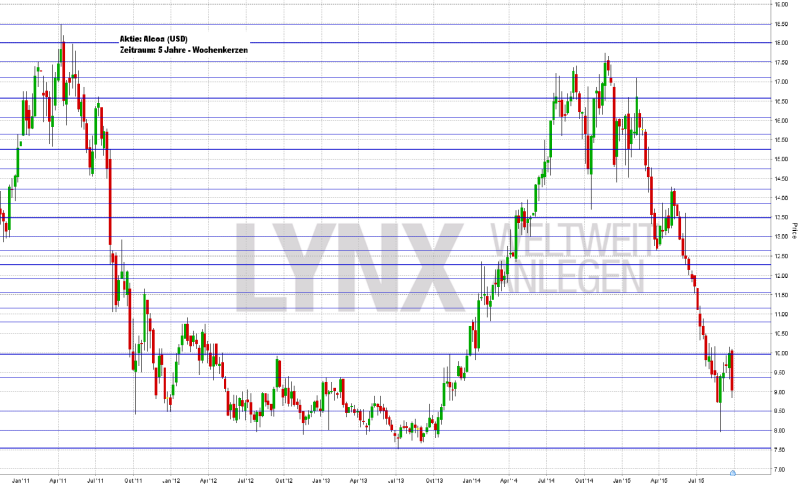 Der Blick auf den Fünfjahreschart lässt erkennen, dass sich der Wert von Alcoa (ISIN: US0138171014 – Symbol: AA – Währung: USD) aktuell in dem häufig angelaufenen Bereich um die Marken 9,00 und 9,50 US-Dollar befindet. Seit Januar fiel der Wert von 17,00 US-Dollar auf dieses recht geringe Niveau, fast ohne nennenswerte Erholungen. Der Freitagsschlusskurs lag nur knapp oberhalb der 9,00-US-Dollar-Marke. An Käufe sollte vorerst nicht gedacht werden, auch wenn der Wert an einem doch recht starken Unterstützungsbereich angekommen ist. Zu kräftig war die vorherige Abwärtsbewegung und Käufe wären eher ein Griff ins fallende Messer, als dass sie eine gesunde Chance auf brauchbare Gewinne böten. Aktuell ist es nicht auszuschließen, dass weitere Tiefs unter 8,00 US-Dollar erreicht werden. Für etwaige Kaufgedanken sollte sich, ähnlich wie bei der Aufwärtsbewegung ab Oktober 2013, eine Sequenz steigender Hochs und steigender Tiefs ausbilden. Ein erneuter gesunder Anstieg wäre dann nicht auszuschließen.