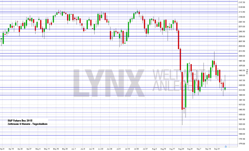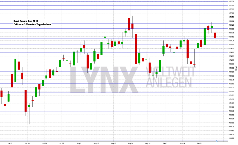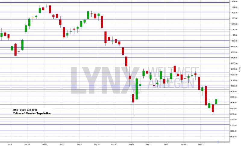 Der deutsche Leitindex bildete am Donnerstag charttechnisch gesprochen gewissermaßen ein zweites Standbein aus. Bis auf ein Tagestief von 9.362,28 Punkte sackte der Xetra-DAX ab. Das alte Verlaufstief vom Montag, den 24.08.2015 liegt bei 9.338,20 Punkten. Zum Xetra-Schluss am Freitag standen nach einem kräftigen Tagesplus von 2,77 Prozent 9.688,53 Punkte auf der Kurstafel. Der XDAX stand um 22:15 Uhr bei 9.630,39 Punkten. Die Rekordmarke von 12.390,80 Punkten wird dieses Jahr nicht mehr zu erreichen sein. An der Wall Street beendete der Dow Jones den Handelstag mit 16.314,67 Punkten, die Rekordmarke liegt hier bei 18.351,36 Punkten. Der NASDAQ 100 notierte zum Handelsschluss bei 4.224,74 Punkten. Sein Jahreshoch liegt zurzeit bei 4.694,13 Punkten, das Allzeithoch aus dem März 2000 bei 4.704,73 Punkten. Der breit gefasste S&P 500 schloss mit 1.931,34 Zählern, der Rekord beträgt 2.134,72 Punkte. Der Euro notierte nach US-Börsenschluss bei 1,1195 US-Dollar. Eine Feinunze Gold war am Spotmarkt für 1.146,20 US-Dollar zu haben, Rohöl der Nordseesorte Brent kostete zum US-Handelsschluss im November-Kontrakt 48,60 US-Dollar das Fass. Der Euro-Bund-Future notierte am Freitag an der EUREX mit einem Schlusskurs von 155,53 Zählern. Die Rendite für zehnjährige Bundesanleihen liegt aktuell bei 0,65 Prozent. Der Spread zwischen zehnjährigen deutschen Bunds und zehnjährigen US-Staatsanleihen (2,16 Prozent Rendite) liegt derzeit bei 151 Basispunkten. Bundesanleihen rentieren bis zu einer vierjährigen Laufzeit mit Negativrenditen (Mitte April rentierten sogar noch achtjährige Läufer im negativen Terrain).