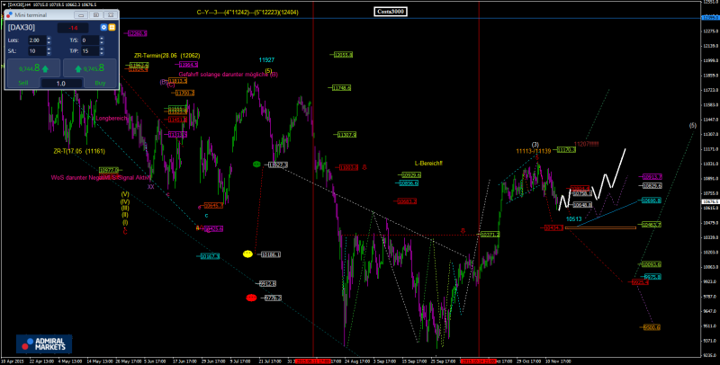 Zur Einschätzung für die neue Handelswoche: Zu Beginn der Woche werden die Pariser Terroranschläge auf die Stimmung der Börsen drücken. Der DAX ist in der vergangenen Handelswoche erneut an der 11.000-Punkte-Marke gescheitert und hat deutlicher zurückgesetzt. Insgesamt ist der Rücksetzer noch nicht dramatisch – wesentlich wird sein, dass die Bullen zeitnah wieder zupacken, was aufgrund der Nachrichten eher unwahrscheinlich ist. Dennoch als Vorbereitung stets beide Seiten: