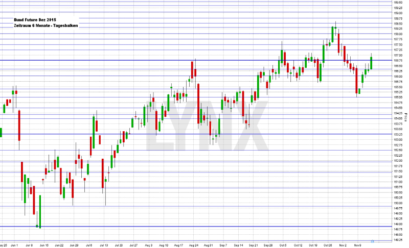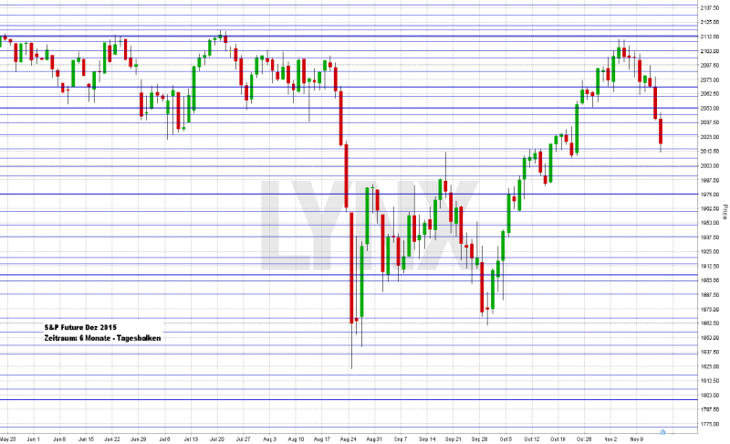 Eine baldige Zinswende in den USA wird wieder wahrscheinlicher – zahlreiche Fed-Offizielle äußerten sich dementsprechend und rücken damit die Dezember-Sitzung in den Fokus der Markteilnehmer. Die US-Kernmärkte sind alle deutlich ins Minus gedreht, auch der Dow Jones und der S&P 500 befinden sich auf 2015er-Basis wieder im roten Bereich. Beim deutschen Leitindex DAX standen am Freitag 10.708,40 Punkte auf der Kurstafel. Die Rekordmarke von 12.390,80 Punkten rückt einmal mehr in die Ferne. Der XDAX stand um 22:15 Uhr bei 10.677,31 Punkten. An der Wall Street beendete der Dow Jones den Handelstag mit 17.245,24 Punkten, der NASDAQ 100 notierte zum Handelsschluss bei 4.502,137 Punkten und der breit gefasste S&P 500 schloss mit 2.023,04 Zählern. Der Euro notierte nach US-Börsenschluss bei 1,0773 US-Dollar. Eine Feinunze Gold war am Spotmarkt für 1.083,91 US-Dollar zu haben, Rohöl der Nordseesorte Brent kostete zum US-Handelsschluss im Januar-Kontrakt 44,47 US-Dollar das Fass. Der Euro-Bund-Future notierte am Freitag an der EUREX mit einem Schlusskurs von 157,05 Zählern. Die Rendite für zehnjährige Bundesanleihen liegt aktuell bei 0,56 Prozent. Der Spread zwischen zehnjährigen deutschen Bunds und zehnjährigen US-Staatsanleihen (2,27 Prozent Rendite) liegt derzeit bei 171 Basispunkten. Bundesanleihen rentieren bis zu einer sechsjährigen Laufzeit mit Negativrenditen (Mitte April rentierten sogar noch achtjährige Läufer im negativen Terrain). In der neuen Handelswoche begibt die Finanzagentur des Bundes Kapitalmarktinstrumente (Schatz) mit einer zweijährigen Laufzeit und einem Emissionsvolumen von 5,0 Mrd. Euro (Neuemission).