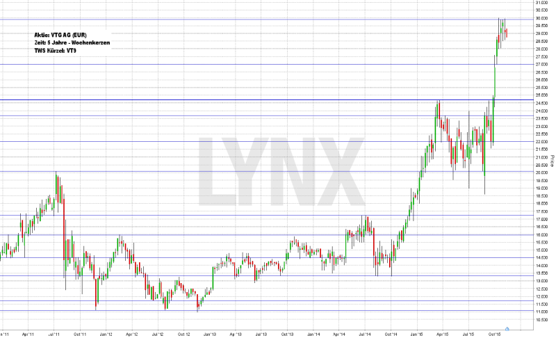 In der Betrachtung der vergangenen fünf Jahre zeigt sich die Aktie der VTG AG (ISIN: DE000VTG9999 – Symbol: VT9 – Währung: EUR) recht bewegungsfreudig, wobei langfristige Trend-Trades nur bedingt umzusetzen gewesen wären. Durch die doch teilweise recht schnellen Wechsel zwischen Aufwärts-, Abwärts- und Seitwärtsphasen war ein nachhaltiges Stop-Management zur Sicherung von Gewinnen kaum umsetzbar. Etwas kurzfristigere Ansätze, mit dem zeitlichen Ziel von ein paar Wochen, hätten jedoch mit gesunden Gewinnen abgeschlossen werden können. Gerade die Long-Bewegungen seit Ende 2014 waren teilweise recht sauber und klar. Generell konnte sich der Wert seit 2012 fast verdreifachen, von damals rund 11,00 Euro ging es kürzlich hinauf bis auf etwa 30,00 Euro. Der Schlusskurs von Freitag lag knapp unter 29,00 Euro. Die VTG-Aktie bietet sich auch in der kommenden Zeit nicht zwingend für langfristige Handelsgedanken an. Zu groß ist die Gefahr ständiger Richtungswechsel, wodurch ein nachhaltiger Trendfolgehandel unmöglich wäre. Gerade auch die in den vergangenen Wochen angestiegene Volatilität bildet kein ideales Handelsfundament. Gegebenenfalls bietet der Wert weiterhin aus einer etwas kurzfristigeren Sicht Chancen. Oberhalb von 27,00 Euro könnte in diesem Fall eventuell die Long-Seite interessant werden. Weitere neue Hochs wären dann nicht auszuschließen.