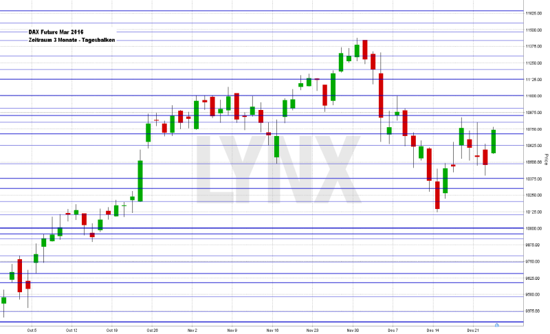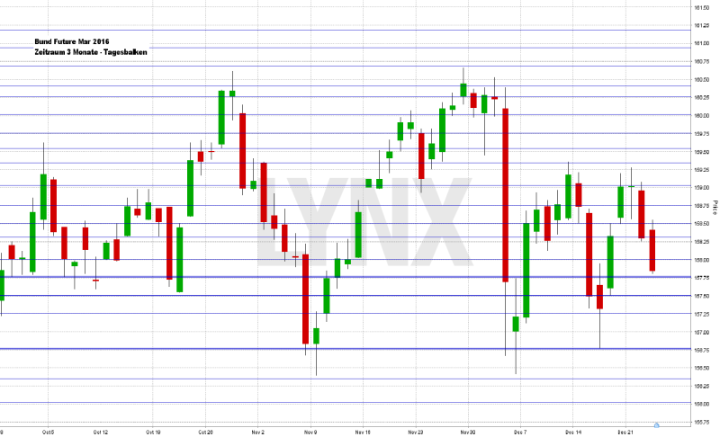 Die letzten Handelstage vor Weihnachten brachten doch noch einen halbwegs versöhnlichen Jahresabschluss. Der deutsche Leitindex schloss am Mittwoch bei 10.727,64 Zählern. Die Jahresperformance für 2015 liegt damit bis dato bei rund 9,4 Prozent. Im Vergleich zum aktuellen Leitzinsniveau eine enorme Rendite. Der XDAX stand um 22:15 Uhr bei 10.753,06 Punkten. An der Wall Street beendete der Dow Jones den Handelstag mit 17.552,17 Punkten, der NASDAQ 100 notierte zum Handelsschluss bei 4.622,772 Punkten und der breit gefasste S&P 500 schloss mit 2.060,99 Zählern (US-Schlusskurse vom Donnerstag, den 24.12.2015). Der Euro notierte nach US-Börsenschluss bei 1,0960 US-Dollar. Eine Feinunze Gold war am Spotmarkt für 1.076,10 US-Dollar zu haben, Rohöl der Nordseesorte Brent kostete zum US-Handelsschluss im Februar-Kontrakt 37,89 US-Dollar das Fass. Der Euro-Bund-Future notierte am Mittwoch an der EUREX mit einem Schlusskurs von 158,00 Zählern. Die Rendite für zehnjährige Bundesanleihen liegt aktuell bei 0,63 Prozent. Der Spread zwischen zehnjährigen deutschen Bunds und zehnjährigen US-Staatsanleihen (2,24 Prozent Rendite) liegt derzeit bei 161 Basispunkten.