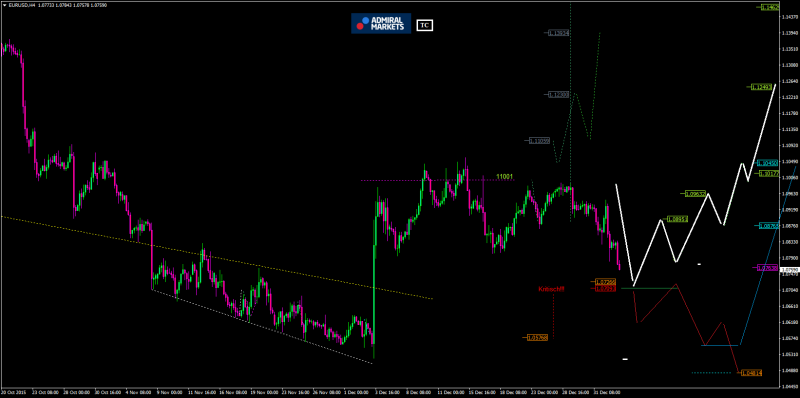 Wir reflektieren im Rückblick die Entwicklung des EUR/USD vom 16.12.2015 bis zum 05.01.2016. Der EUR/USD konnte sich gleich zu Beginn des Betrachtungszeitraums noch einmal dynamisch an und kurz über die 1,1000 schieben. Das Hoch im Betrachtungszeitraum wurde am 16.12. bei 1,1010 markiert. Dann ging es zunächst an die 1,0800. Von hier aus nahm der EUR/USD dann erneut Anlauf auf die 1,1000. Er kam trotz vieler Versuche nicht über diese Marke hinaus. Zu Jahresbeginn zeigte sich das Währungspaar schwach. Nachdem es noch einmal an die 1,0940 gestiegen war, gab es deutlich nach und unterschritt am Dienstag die wichtige Unterstützung bei 1,0770. Das Tief des Betrachtungszeitraums wurde am 05.01.2016 bei 1,0701 markiert.