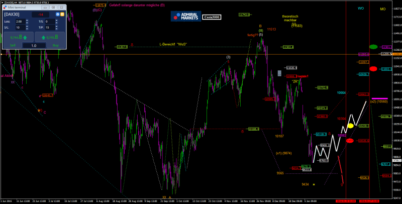Die Handelswoche war miserabel, genau das Gegenteil der ersten Handelswoche 2015. Für alle Long-Engagements: Vergessen wir nie, dass mit Hebelprodukten auch short getradet werden kann und dass es für Short-Trader herrliche Zeiten gibt! Das Wochenhoch lag deutlich unter dem der vergangenen fünf Handelswochen. Das Wochentief lag fast 900 Punkte unter dem Tief der Silvesterwoche. Die Wochen-Range war mit 747 Punkten noch größer als in der KW 50/2015 und lag damit über dem Durchschnitt. Die Wochenbilanz ist mit über 900 Punkten Verlust katastrophal. Insgesamt hat sich das Chartbild in den letzten Handelstagen deutlich eingetrübt.
