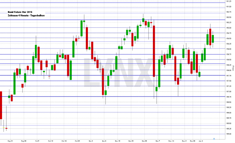 Der Bund-Future verließ in der vergangenen Woche den beobachteten Seitwärtsbereich zwischen 156,75 und 159,25 Punkten nach oben, was zu dem einen oder anderen Long-Trade führte. Lediglich im Donnerstagshandel war die Short-Seite von Vorteil. Der Freitagsschlusskurs lag bei knapp 159,75 Punkten und damit knapp 200 Ticks höher als in der Vorwoche. Die Long-Seite scheint sich vorläufig etabliert zu haben, was auch in den kommenden Tagen zu dem einen oder anderen Long-Trade führen könnte. Ein erneuter Kursanstieg in Richtung 160,25 ist nicht auszuschließen und auch ein Überschreiten der Hochs von November und Dezember 2015 ist durchaus realistisch. Die Short-Seite wäre aus aktueller Sicht frühestens bei Kursen unterhalb von 158,50 Punkten erneut interessant.