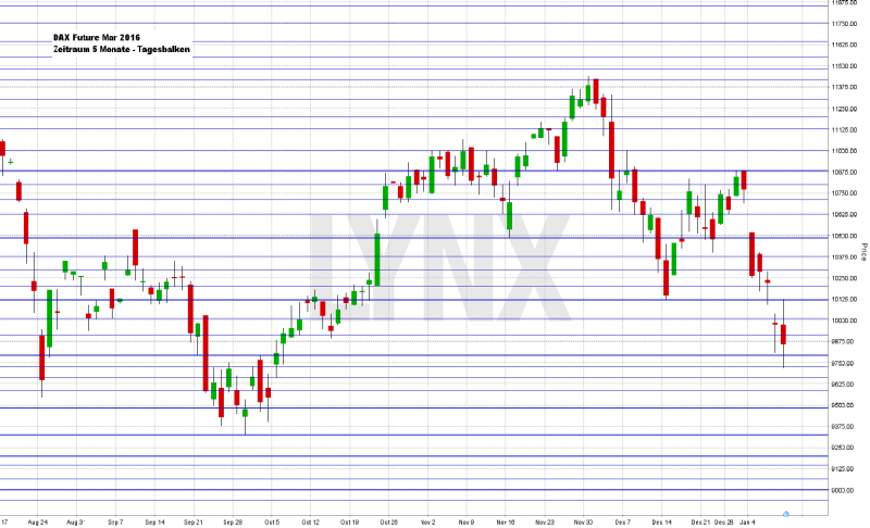 9.869,13 Punkte – man könnte denken, seit diesem Kurs vom 02.01.2015 sei nicht viel passiert. Vergessen sind die Höhenflüge zum Rekordhoch von 12.390,80 Indexpunkten. Wer Gewinne nicht mitnimmt, wird bestraft – Kostolanys Ansatz, zu kaufen und sich schlafen zu legen, fruchtet einmal mehr nicht. Es ist ein rekordverdächtig schlechter Start ins neue Börsenjahr 2016. Beim deutschen Leitindex DAX standen am Freitag 9.849,34 Punkte auf der Kurstafel – ein Wochenminus von 8,32 Prozent. Die Rekordmarke von 12.390,80 Punkten wirkt beinahe surreal. Der XDAX notierte um 22:15 Uhr bei 9.748,03 Punkten. An der Wall Street beendete der Dow Jones den Handelstag mit 16.346,45 Punkten, die Rekordmarke liegt hier bei 18.351,36 Punkten. Der NASDAQ 100 notierte zum Handelsschluss bei 4.270,782 Punkten. Sein 2015er-Hoch liegt bei 4.739,75 Punkten. Der breit gefasste S&P 500 schloss mit 1.922,03 Zählern, der Rekord beträgt 2.134,72 Punkte. Der Euro notierte nach US-Börsenschluss bei 1,0922 US-Dollar. Eine Feinunze Gold war am Spotmarkt für 1.104,15 US-Dollar zu haben, Rohöl der Nordseesorte Brent kostete zum US-Handelsschluss im Februar-Kontrakt 33,55 US-Dollar das Fass. Der Euro-Bund-Future notierte am Freitag an der EUREX mit einem Schlusskurs von 159,81 Zählern. Bundesanleihen bis zu einer fünfjährigen Laufzeit notieren mit einem Negativzins. Die Rendite für zehnjährige Bundesanleihen liegt aktuell bei 0,51 Prozent. Der Spread zwischen zehnjährigen deutschen Bunds und zehnjährigen US-Staatsanleihen (2,12 Prozent Rendite) liegt derzeit bei 161 Basispunkten. In der neuen Handelswoche begibt die Finanzagentur des Bundes am 11.01.2016 Geldmarktinstrumente (Bubill) mit einer sechsmonatigen Laufzeit und einem Emissionsvolumen von 3,0 Mrd. Euro (Neuemission), am 12.01.2016 Kapitalmarktinstrumente (Bund) mit einer zehnjährigen Laufzeit und einem Emissionsvolumen von 5,0 Mrd. Euro (Neuemission) und am 13.01.2016 Kapitalmarktinstrumente (iBund) mit einer zehnjährigen Laufzeit und einem Emissionsvolumen von 1,0 Mrd. Euro (Aufstockung).