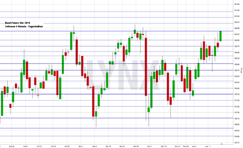 Der angenommene Zielbereich des Bund-Futures von 160,25 Punkten konnte am Donnerstag der vergangenen Woche erreicht werden. Vorher fiel der Markt bis Dienstag auf circa 158,75 Punkte, was zu vorteilhaften Einstiegsszenarien führte. Der Schlusskurs am Freitagabend lag nur knapp unter dem Wochenhoch bei rund 160,40 Zählern. Es wird jetzt sehr interessant, wie sich der Markt am aktuellen Schlusskursbereich verhalten wird. Durch den scheinbar weiterhin anhaltenden Vorteil auf der Longseite, dürfte ein Erreichen weiterer Hochs als nicht unwahrscheinlich gelten. Ideal wären gegebenenfalls Käufe an Unterstützungen. Verkäufe sind aus aktueller Sicht kaum interessant und sollten wenn nur mit großer Vorsicht durchgeführt werden.