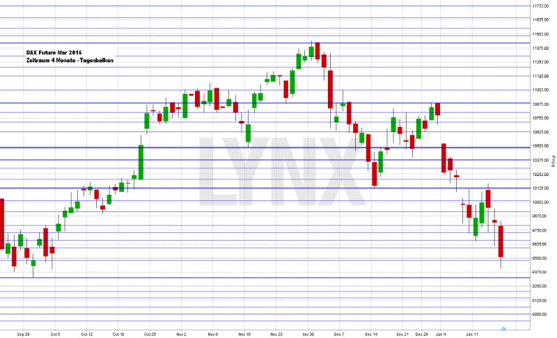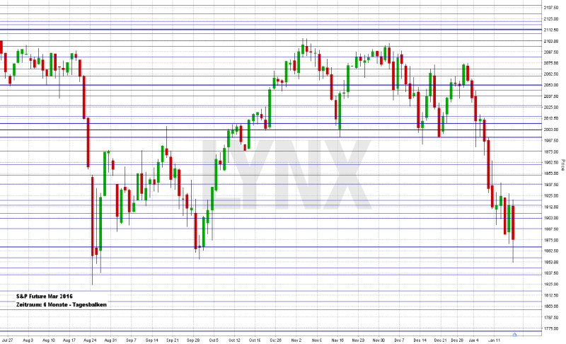Mit einem guten Gewinn im S&P Future konnte die vergangene Handelswoche abgeschlossen werden. Die Annahme weiterer Tiefkurse wurde bestätigt und leichte Erholungen boten immer wieder perfekte Einstiege an den Widerstandbereichen. Das Wochenhoch lag knapp unter der Marke von 1.950 Punkten das Wochentief knapp unter 1.850 Punkten, was eine Wochenschwankung von rund 100 Punkten entsprach. In der kommenden Woche könnte es gegebenenfalls zu einer leichten Erholung kommen. Denn durch das Erreichen der Tiefs vom September 2015 in der vergangenen Handelswoche, verbunden mit einem etwas höheren Volumen, besteht die Möglichkeit einer technischen Gegenbewegung. Short-Trades sind zwar weiterhin von Vorteil, da sich der Trend klar auf der Abwärtseite befindet , aggressive Handlungen auf der Short-Seite sollten jedoch etwas zurückgenommen werden. Long-Trades sind trotz der Annahme einer Erholung nicht zwingend einzugehen.